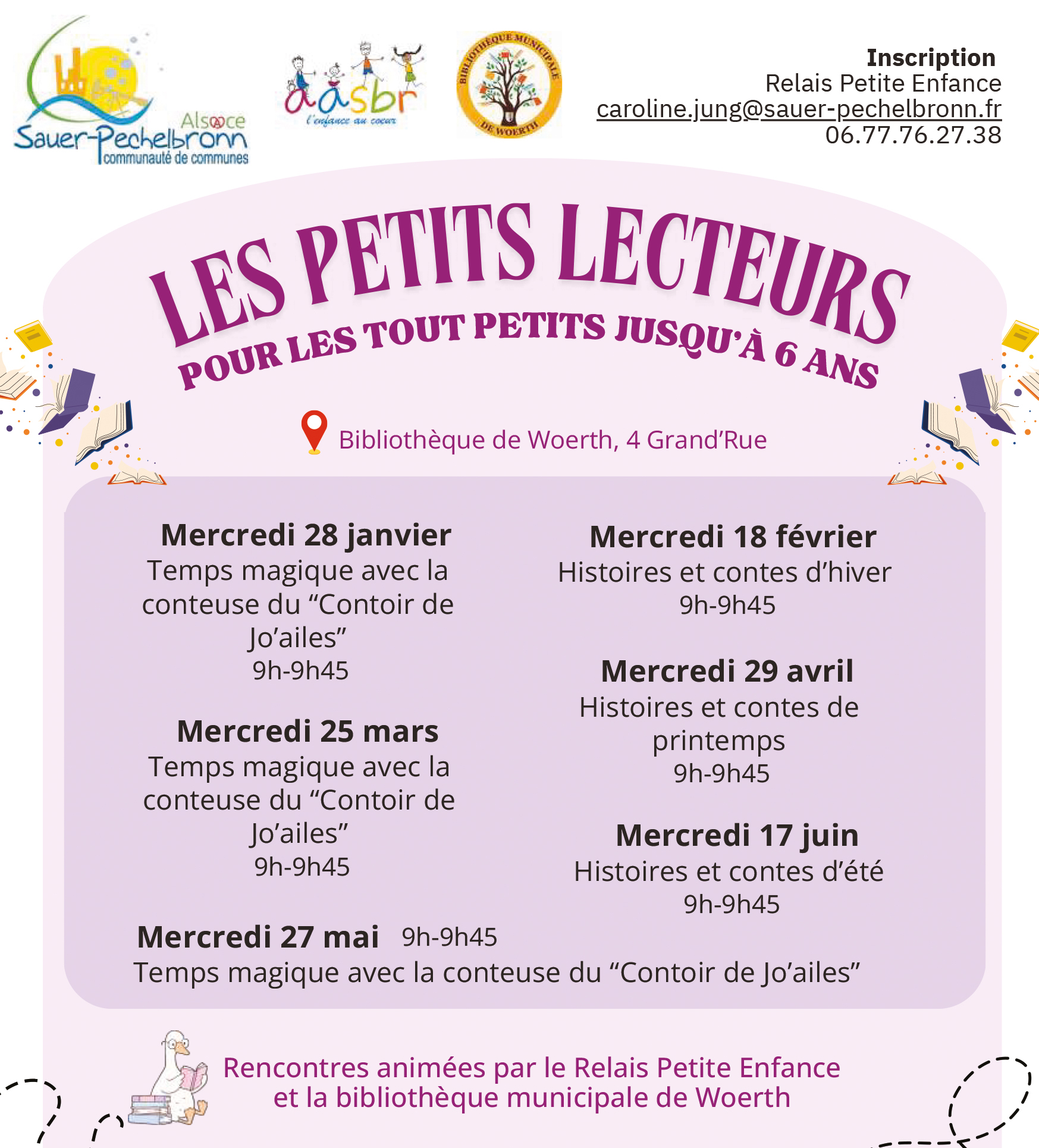 Le Relais Petite Enfance organise en partenariat avec la bibliothèque municipale de Woerth des événements de lecture pour les tout petits. Inscription : Relais Petite Enfance de la communauté de communes Sauer-Pechelbronn (06 77 76 27 38)