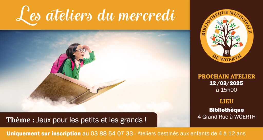 C’est le rendez-vous incontournable pour les enfants de 4 à 12 ans ! Au programme : lectures et bricolages sur le thème « les contes ailleurs ». Uniquement sur inscription au 03 88 54 07 33 durant les horaires d’ouverture de la bibliothèque ou par message sur la page Facebook (places limitées !).