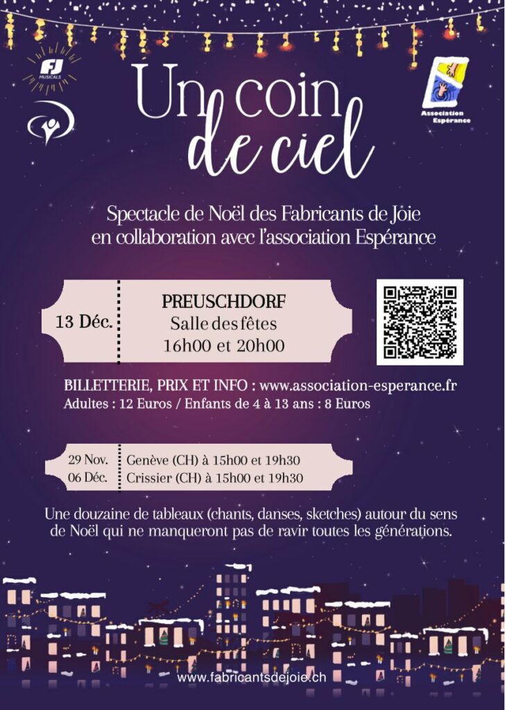 « Un coin de ciel » est un spectacle de Noël intergénérationnel, de qualité, adapté à un large public, varié, touchant et plein d’humour. « Il présente une succession de tableaux variés sur le thème de la Nativité. Le récit biblique est tour à tour transposé dans les rues de New-York, abordé du point de vue de Marie ou des bergers. » Qualité des arrangements musicaux, profondeur des textes, mises en scène colorées, chorégraphies joyeuses et variées, le niveau artistique est à la hauteur de leurs précédentes comédies musicales « La fabuleuse histoire de George Muller » et « Gladys Aylward, au-delà des montagnes » (que vous pouvez d’ailleurs (re)voir gratuitement sur YouTube).