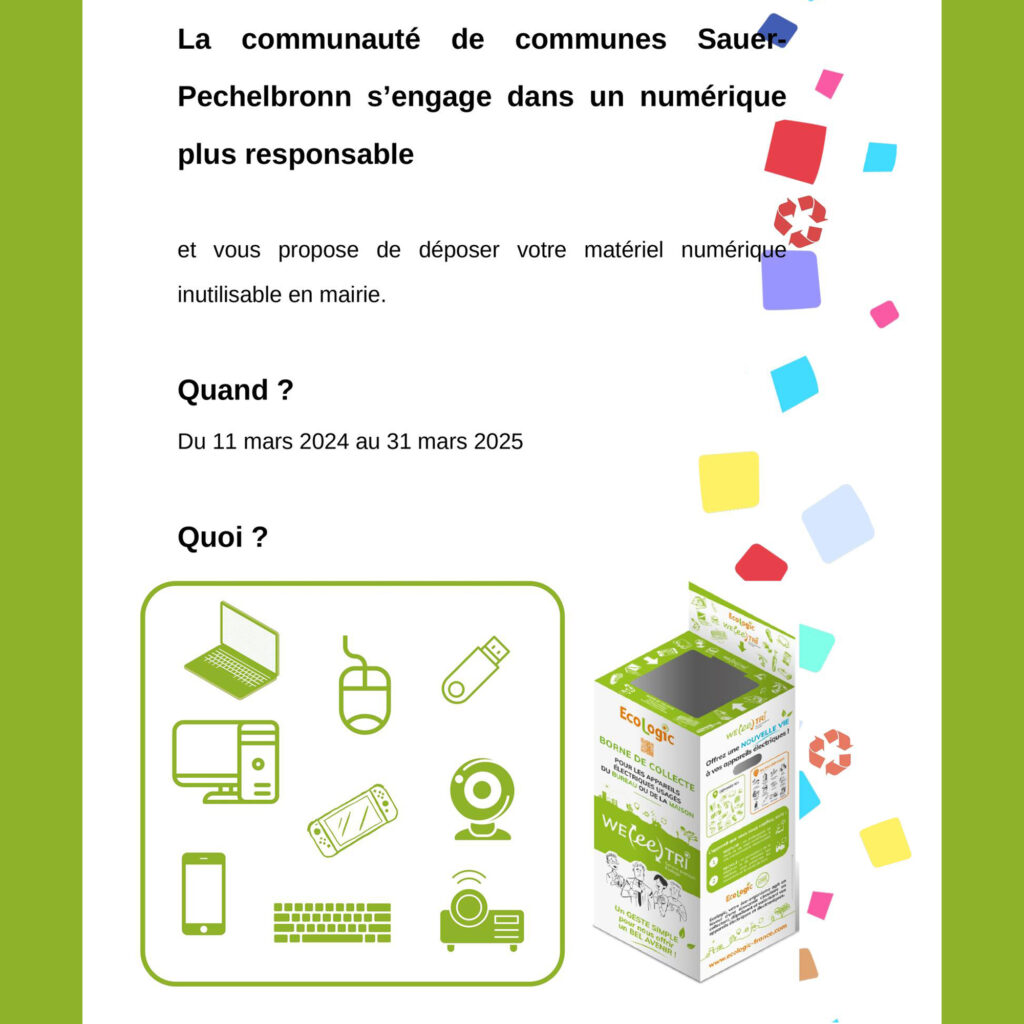 Le territoire de la Communauté de communes Sauer-Pechelbronn et ses mairies se mobilisent pour une campagne de recyclage des outils numériques et vous propose de déposer votre matériel numérique inutilisable en mairie (𝑜𝑟𝑑𝑖𝑛𝑎𝑡𝑒𝑢𝑟, 𝑐𝑙𝑒́ 𝑢𝑠𝑏, 𝑡𝑒́𝑙𝑒́𝑝𝘩𝑜𝑛𝑒, 𝑤𝑒𝑏𝑐𝑎𝑚…). Le numérique est responsable de 4% des émissions mondiales de gaz à effet de serre et on estime que d’ici 2025 cette pollution numérique va doubler.
